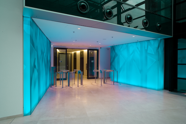 Our wall claddings are modular in design and can therefore be used flexibly. In addition to high-strength, from 10 mm thick toughened safety glass or laminated safety glass, the two-part system consisting of a load-bearing construction and Glasbau Hahn 2-way swivel fitting is used. The opening takes place mechanically or by automatic unlocking. There are practically no limits to the design of our wall claddings: they can be digitally printed or painted in any RAL colour. Illuminated from behind, they transform rooms into impressive atmospheric worlds.